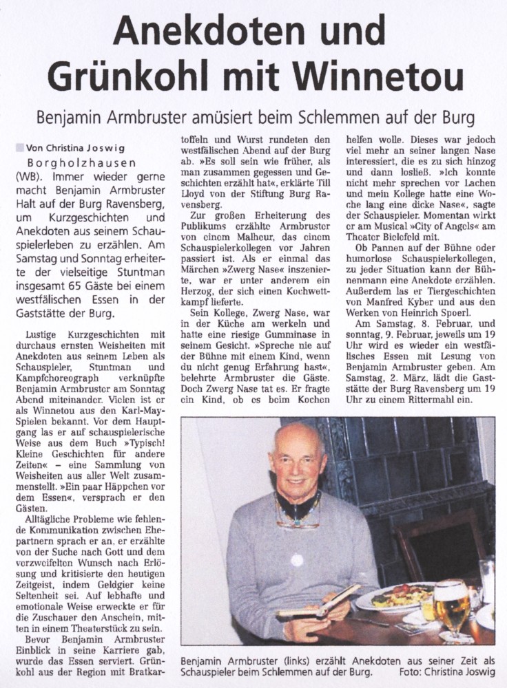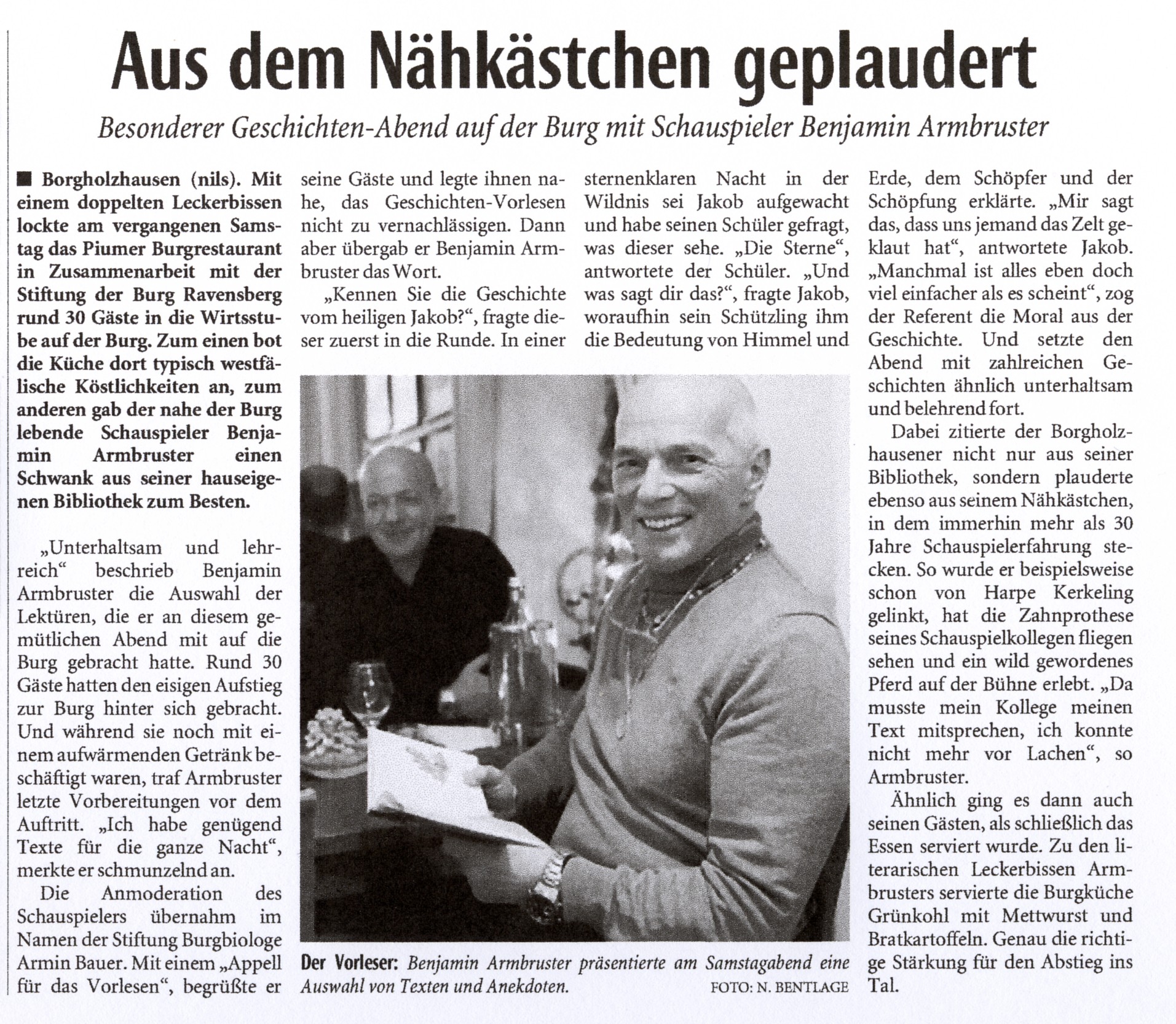 Kassler mit Sauerkraut und Kartoffelbrei/Bratkartoffeln im Burgrestaurant, garniert mit heiteren und skurrilen Geschichten, vorgetragen vom Schauspieler Benjamin Armbruster