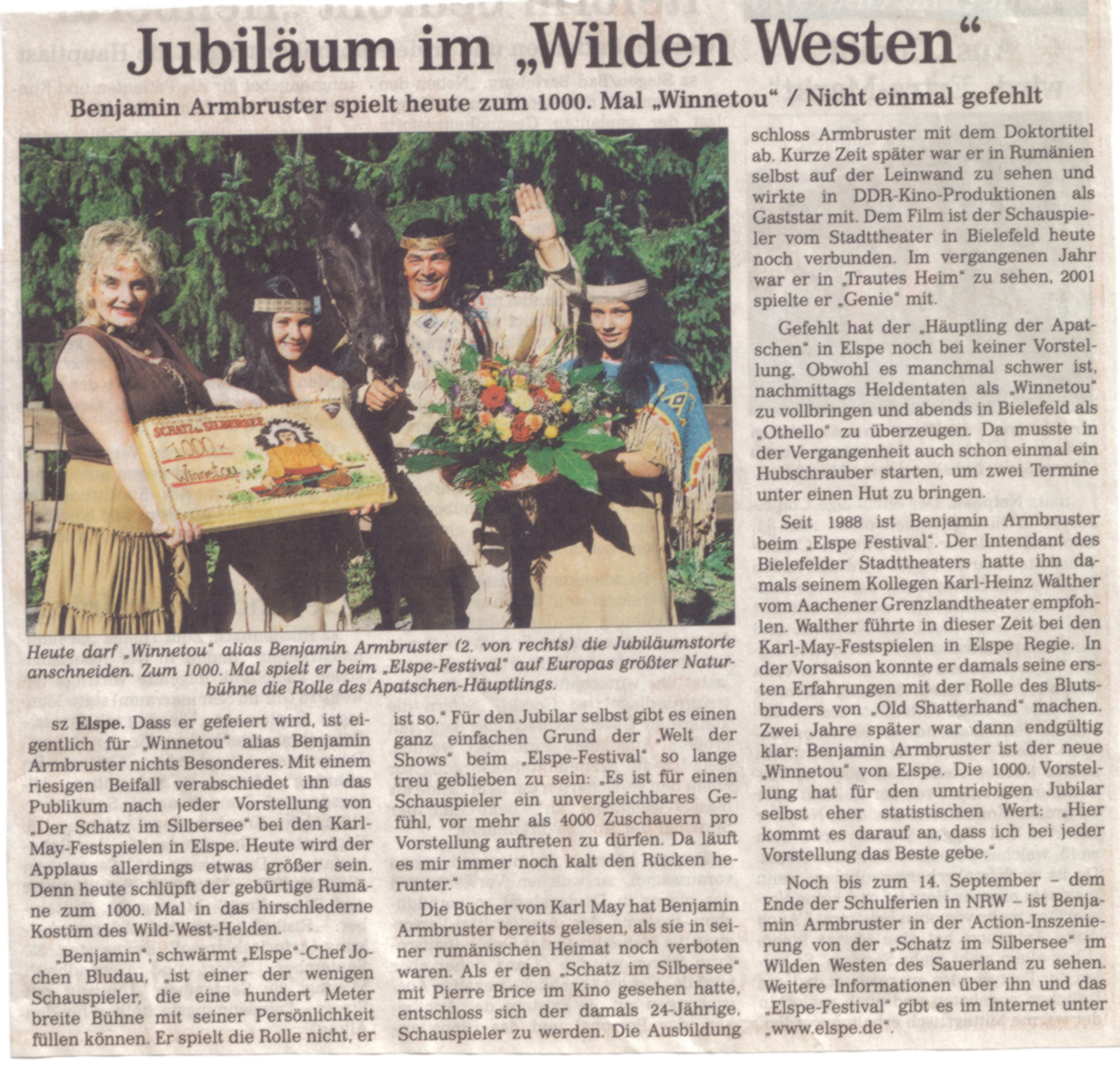 So spielt Benny ihn nun bis 2011 & in 2012 in einem Prolog. Am 28.08.2003 war seine 1000. Vorstellung als Winnetou